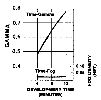 The curves of all the strips are plotted and the contrasts measured, usually Gamma, the slope of the straight-line portion of the curve. A graph plotted of the contrast against the gamma is the time gamma curve for that stock in that processor and any contrast within these limits can be achieved by interpolation.