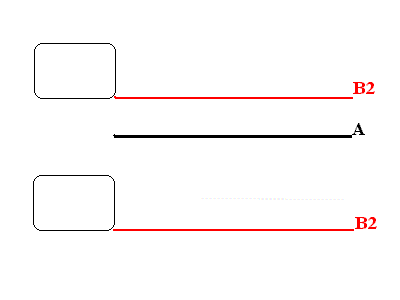 position (in black, A). The two red lines (B1 and B2) show the range of