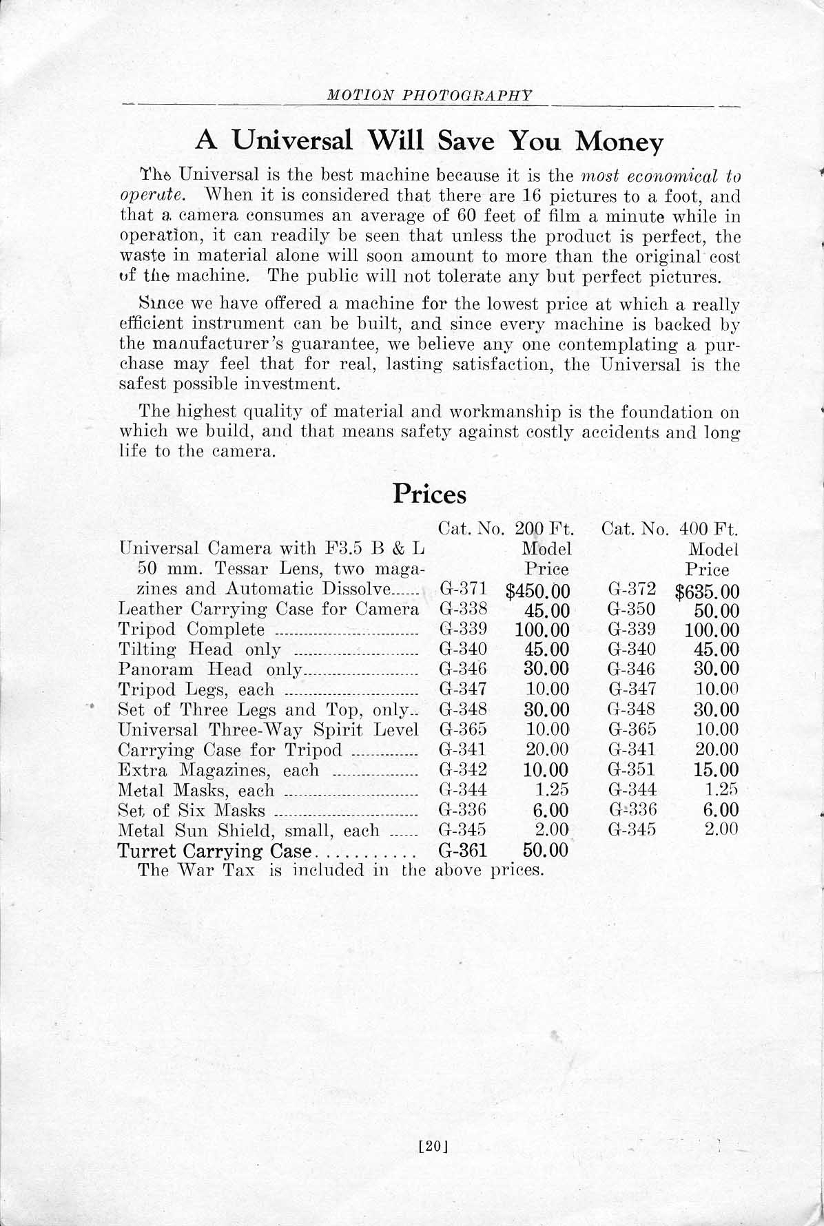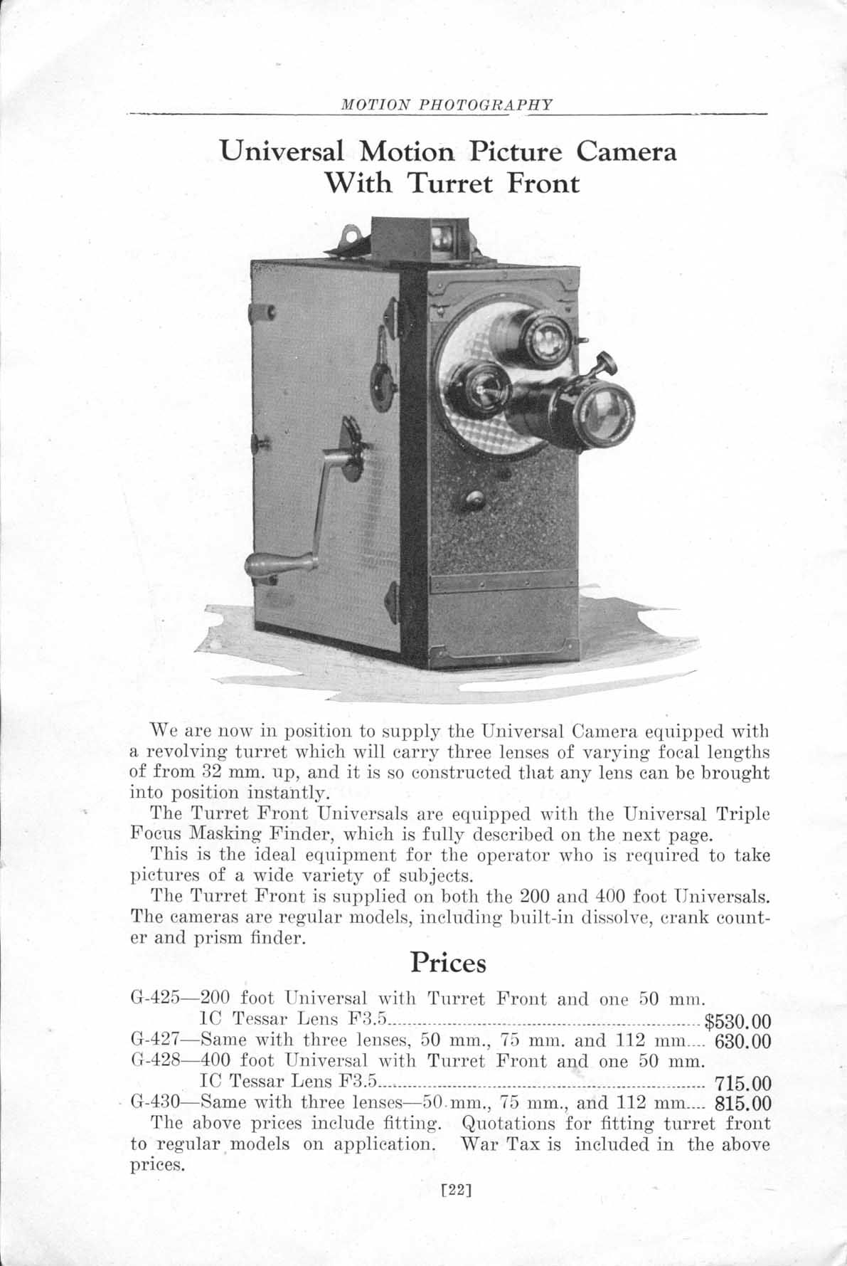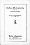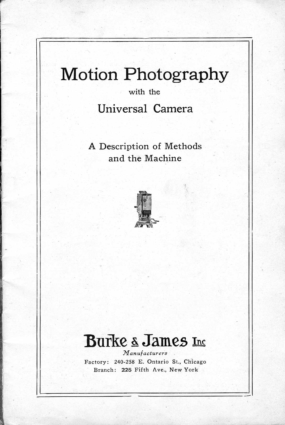 'Motion Photography with the Universal Camera' published by Burke & James Inc of 240-258 E Ontario Street Chicago. The booklet is undated. Buckey Grimm provided the following information: In the August 1921 edition of American Photography there is a short mention that states Burke and James of Chicago Ill, has just issued for distribution 2 booklets. One of which was a catalog of "Universal Camera's" entitled "Motion Photography". |