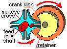 In the Maltese cross system, which is the system most used for screening, the wheel which transfers the impulse to the film feeder system (the crank disk) must make one full turn to move the Maltese cross once. The Cross is connected to a sprocket wheel, which revolves by one-quarter turns (four sprocket holes) feeding in one frame. Apart from this, the shutter, which is synchronized with the crank disk, shuts out the projector light while the Maltese cross gear roller is feeding the film through. The combination of these mechanisms, visual discontinuity and the persistence of vision afford the possibility of an on/off projection of fixed images being perceived as being shown on the screen with the continuity which is required to provide viewers with the sensation of viewing movement.