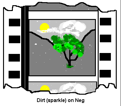 Dirt Dirt on the printing master, often called sparkle, behaves similarly to scratches in that dirt on a negative will be white in the final print.