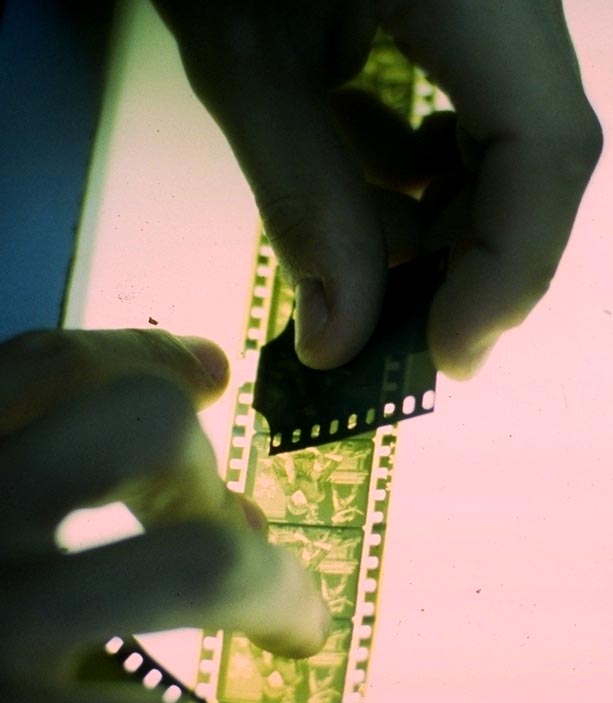 A piece of film with some repaired perforations. |