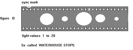 We can now get to the method of passing the "How much light" to the printing machine. We have already mentioned that the B&H D and J printers used a hand written card using numbers between 1 and 22 and that the Debrie and Union used a chart with circular holes of varying sizes cut into it. These went from 1 to 20. Illustration LYNES CHART Union, B J Lynes and Debrie also had a system using cardboard film. The value of the light change was determined by the position of a pair of rectangular holes. The five positions in the first row had the values of 1,5,9,13,17 and the four positions in the second row had the values of 0,1,2,3 so that two holes can give us all the values between 1 and 20. Vinten printers used a cardboard chart but 70 mm in width. The Lawley as we have already mentioned used the staples to give the light value. These went from 11 to 1. With 1 giving the most light unlike all the other systems where 1 was the lowest light.