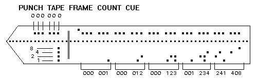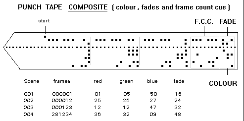 The B&H Model C uses a computer paper tape with eight rows of holes and a row of tractor feed holes. The first six holes have values of 1,2,4,8,16 and 20. The other two holes are used for start and stop information and information for automatic fades. Each light value is recorded as a set of three rows of holes because the Model C is designed for additive colour printing so the Red Green and Blue light information is required for each cue. When printing B/W each row has the same numbers. It is worth noting that although it is normal for the values to be R G B some labs use B G R.
