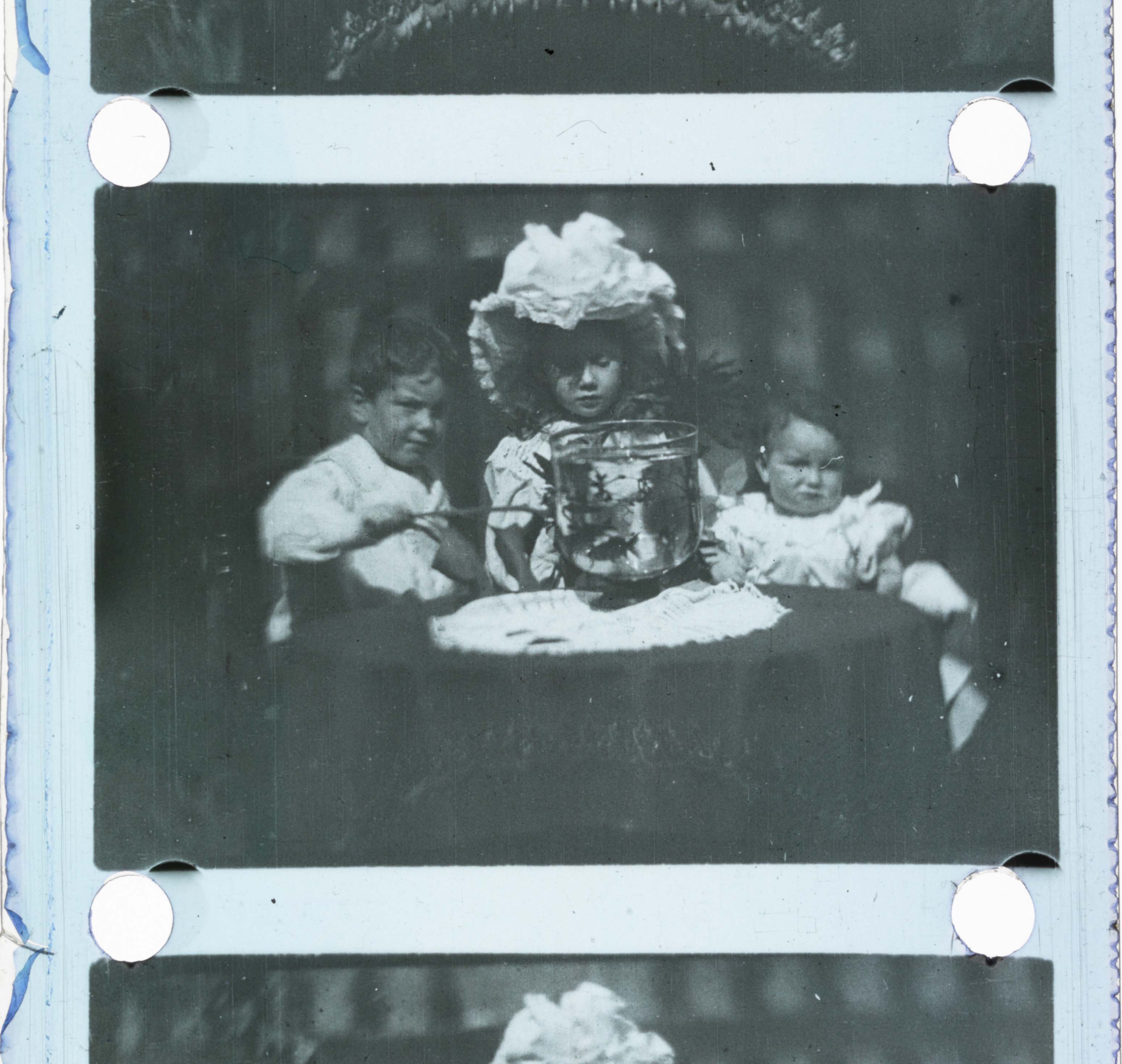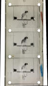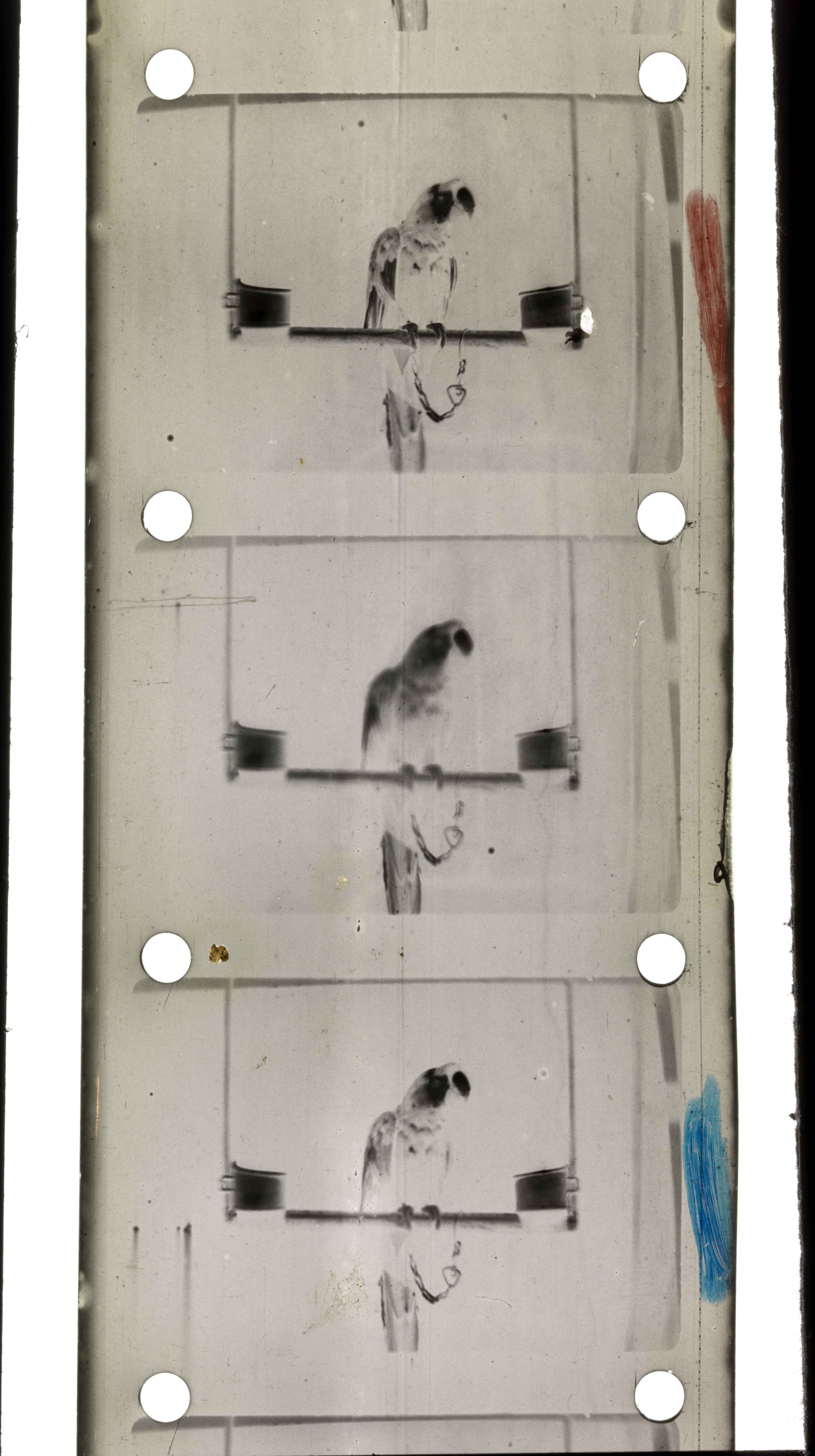 has not yet been established. The Films:There are 10 rolls of film and 4 short sections, two of which are prints which have been tinted blue, perhaps as an experiment to improve colour reproduction. Blue tinted positive Negative Films Parrot - 207 frames Goldfish Bowl - 162 frames Street scene with horse drawn buses - 124 frames Soldiers matching - 140 frames Children at table with goldfish bowl - 133 frames Parrot wider shot - 195 frames Girl on Swing - 97 frames Positive Films Pier to street scene Brighton? This is a tracking shot - 462 frames Test Roll; Parrot, Boy and Girl on Swing with Flag, Children with goldfish bowl, Parrot. The final parrot section appears to be a number of prints of the same section.- 4072 frames Parrot - 164 and 78 frames Total 5831 frames.
