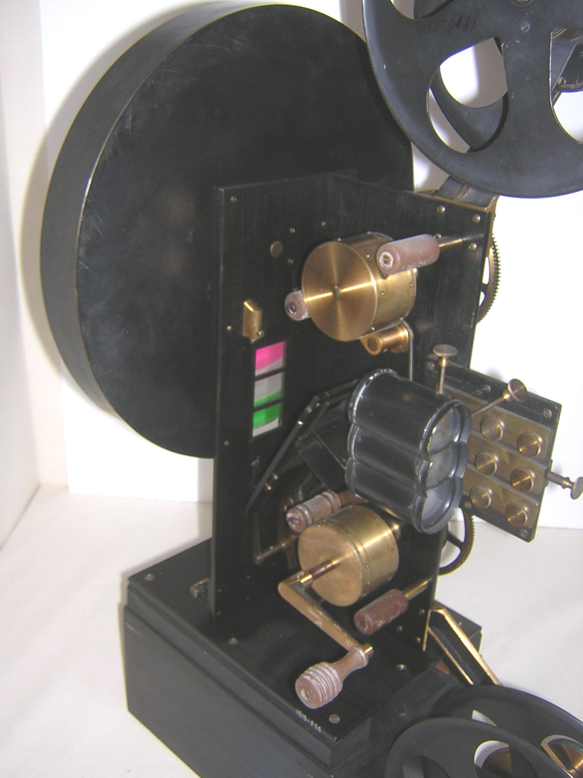 The film was shot using red, green and blue filters sequentially. The positive film was projected using a projector with three lenses which superimposed three frames at a time through a rotating filter with red green and blue filters. You first viewed (as an example) frame 1 through a red filter, frame 2 through a green filter and frame 3 through a blue filter simultaneously. The projector pulled down the film one frame; the filter wheel rotated and you viewed frame 2 through a green filter, frame 3 through a blue filter and frame 4 through a red filter and so on. Unfortunately Turner was unable to achieve steady, satisfactorily registered pictures with his projector. After he died further attempts to make the system work by Urban and George Albert Smith were unsuccessful. IllustrationsPictures from left :to right (click thumbnail to enlarge) Lee-Turner projector Michael Harvey with the projector Digital composition from copied original Original 1 ½ inch film with crayon marks to indicate which frame is which colour First test printing Digital composition from another set of frames note, the fringing caused by movement of the subjects between taking the red, green and blue frames. This is known as time -parallax error David Cleveland and Brian Pritchard printing at the National Archive printing the originals Gate containing frame Perforator built by Alfred Darling - on display at the National Media Museum, Bradford. Biographical DetailsEdward Raymond Turner was born in 1873 in Clevedon, Somerset, according to the 1891 census. He married Edith Mary Gardener on the 2nd May 1895 at Holy Trinity, Hounslow. They had three children Agnes May born in 1896, Alfred Raymond born in 1899 and Wilfred Sydney born in 1902. Turner died of a heart attack in his workshop in 1903. He was buried in Hounslow on the 12th March 1903. Lee had withdrawn his financial backing and Turner sold all of his equipment and the patents to Charles Urban who then employed George Albert Smith to make the system work after the death of Turner. Smith was unsuccessful and he then went on to work on Kinemacolor. There is some argument as to who the children are and where the film was shot and by whom. George Albert Smith had 2 children according to the 1901 census, Harold aged 11 and Dorothy aged 10. It seems likely that the frames showing 3 children are Turner's children and were probably shot in the gardens of Turner's house at 8 Queen's Road, Hounslow.. Details of the ProjectDavid Cleveland and myself had been asked by the NMM to copy the film so that it can be seen. We built a gate to take the 1½ inch film and copied it frame by frame on a Nielsen-Hordell optical printer at the bfi/National Archive. It was a very time consuming process as each frame has to be placed in the gate by hand before being photographed. It took about an hour to copy 100 frames. We were determined to copy the film back onto 35mm polyester film so that it could be preserved long term; there is always a danger that digital files will disappear or not survive. The longevity and permanence of digital files has not yet been established. Once we had copied all the frames they had to be combined to produce colour pictures. This can be done relatively easily by digital methods - the samples above were made using scans and Photoshop 7.0 to combine the images. The 35mm duplicates were scanned at 4K resolution on an Arriscan and then digitally combined using Smoke software. It is also hoped to combine the images photographically - time and funding permitting. The major problems with the system were time-parallax errors caused by shooting the frames sequentially and the difficulty in lining up the three lenses during projection. The three lenses were used so that three frames could be projected simultaneously to try to minimise the time-parallax errors and also to eliminate the flashing caused when sequential frames are projected sequentially through red, green and blue filters. Most book references to the film mention that it was projected at 48 frames per second ,we are convinced that this was not so; we estimate that they were projected at 16 frames per second. Viewing the frame by frame copies the films look correct at 16fps. The confusion seems to arise because three frames were shown at a time on the Lee-Turner Projector but the projector pulled down 1 frame at a time. At 48 frames a sec some of the test films would only last 2 secs and from the videos you can see that they last much longer. David Cleveland explains why we chose