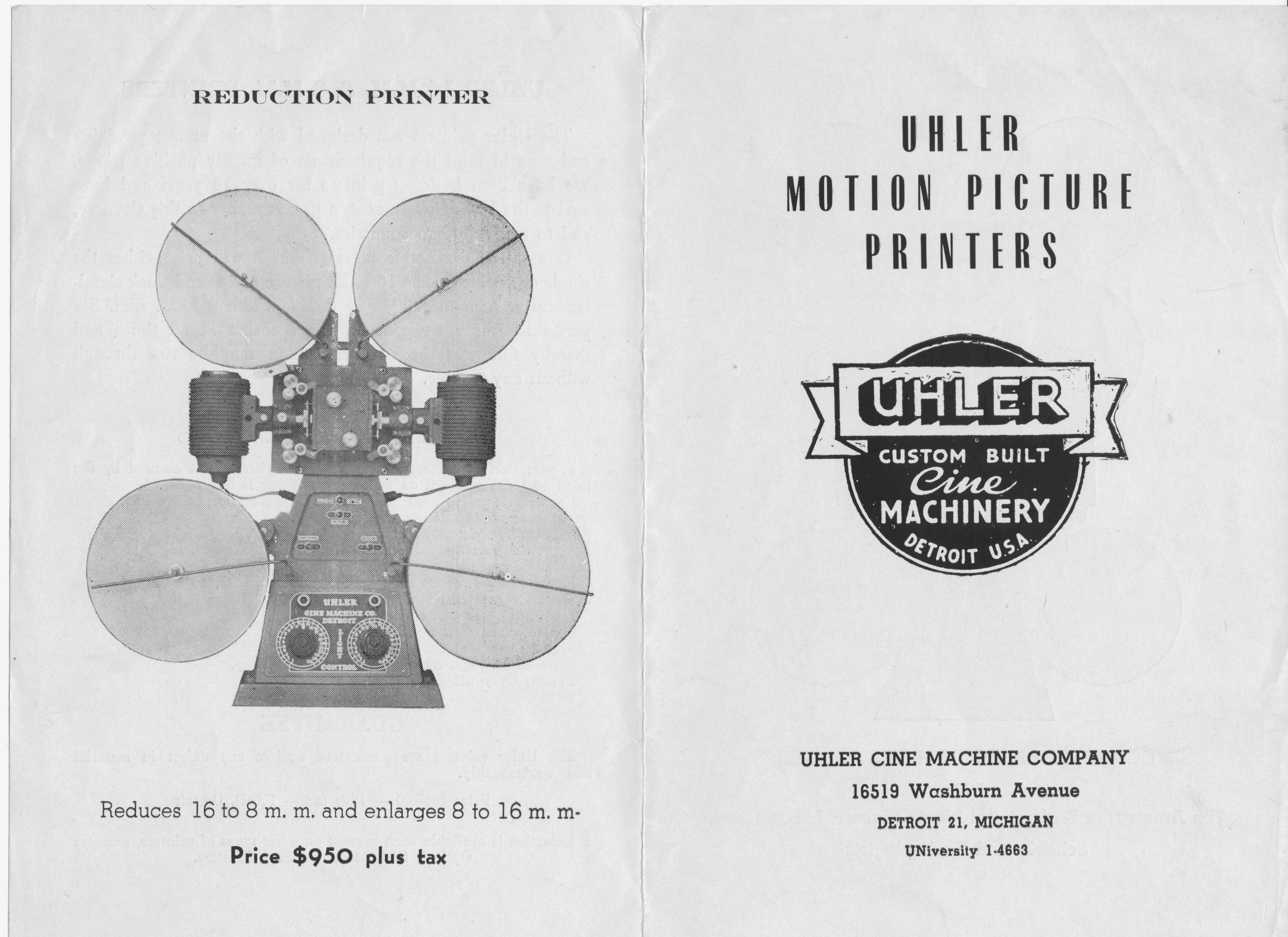 Uhler Motion Picture PrintersThis is a leaflet produced by the Uhler Cine Machine Company of 16519 Washburn Avenue, DETROIT 21, Michigan, USA. The leaflet describes a printer that would reduce 16mm to Standard 8mm and enlarge Standard 8mm to 16mm. Louis Steven Uhler had two US Patents: US 1409980A 21 March 1922 for a Motion Picture Camera - the special features of the camera were that it was able to run at 16 frames per sec or 2 frames per second and was also fitted with an automatic mechanism for dissolves. US 171920A 2 July 1929 for a Motion Picture Machine that could be used as a camera or a projector. Boxoffice magazine of the 2 July 1938 mentions that Uhler were discontinuing the manufacture of 35mm sound projectors and the edition of 25 February 1939 says that the dies for Uhler's new projector are being completed and the machine will be on the market in 30 days. The company was described as the Detroit Projector Company. Mentions of Uhler can be found in 'American Cinematographer' Volume 44 1963 page 370 and 'Encyclopaedia of Photography' 1970 page 1128. |