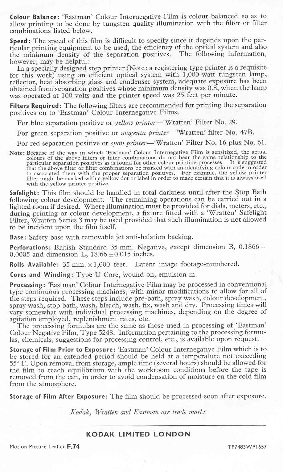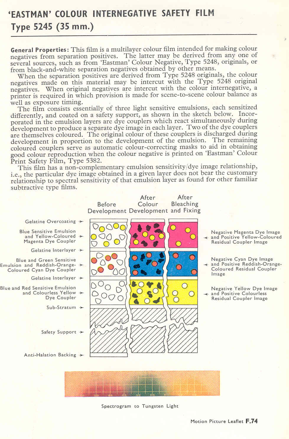 . 'Kodak' Colour Internegative 5245 had a blue sensitive layerthat produced magenta dye; a green sensitive layer that produced cyan dye and a red sensitive layer that produced yellow dye. Another film where the colour of the dye produced did not have the normal relationship to the colour sensitivity of the layer was Gasparcolor. This was a reversal colour print stock that was used for making colour prints from separation positives . It used the process called dye destruction .