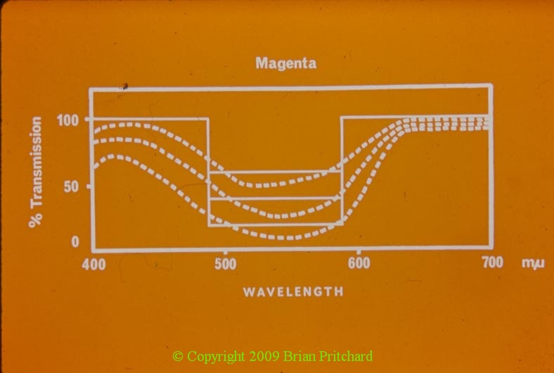 A dye used in colour film should ideally be what is described as narrow-cut. Each of the three dyes used should control only one colour. For example the magenta dye should only control green light and let all of the blue and red light through. When a dye is controlling colours it should not control, it is called unwanted absorption.