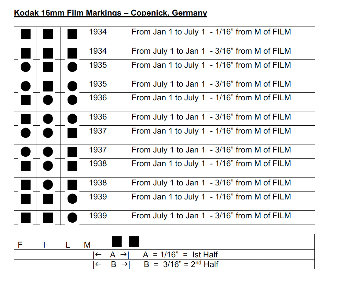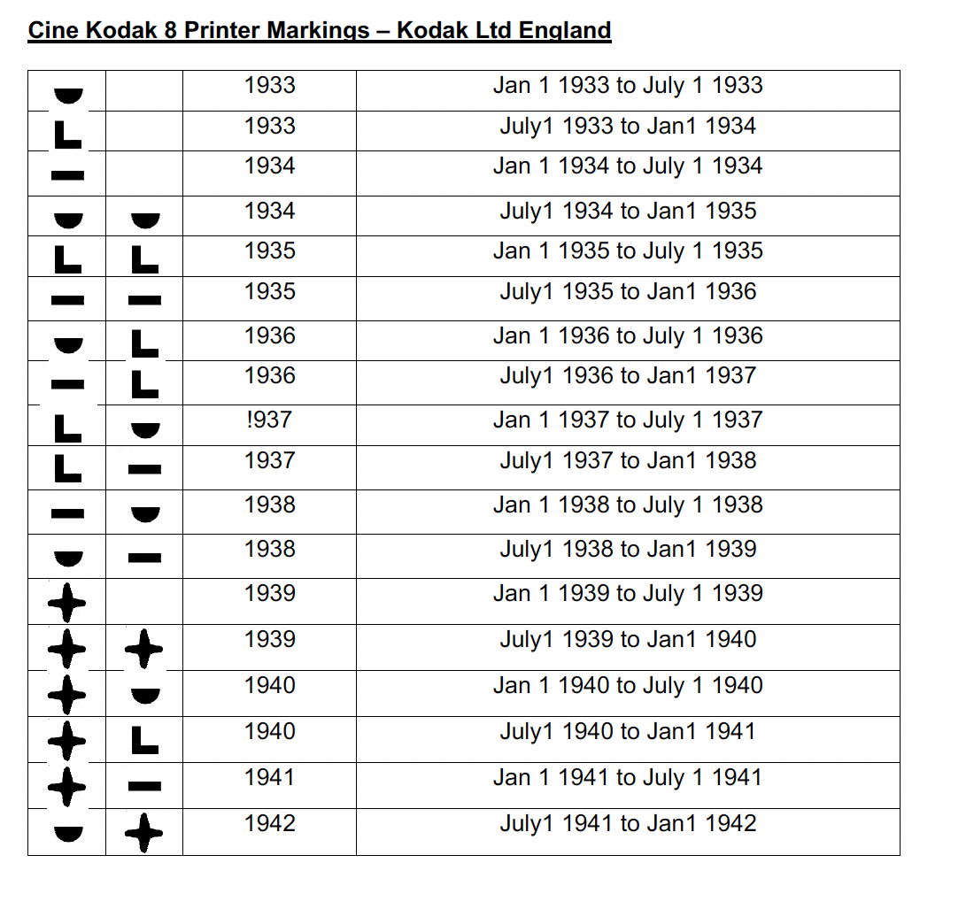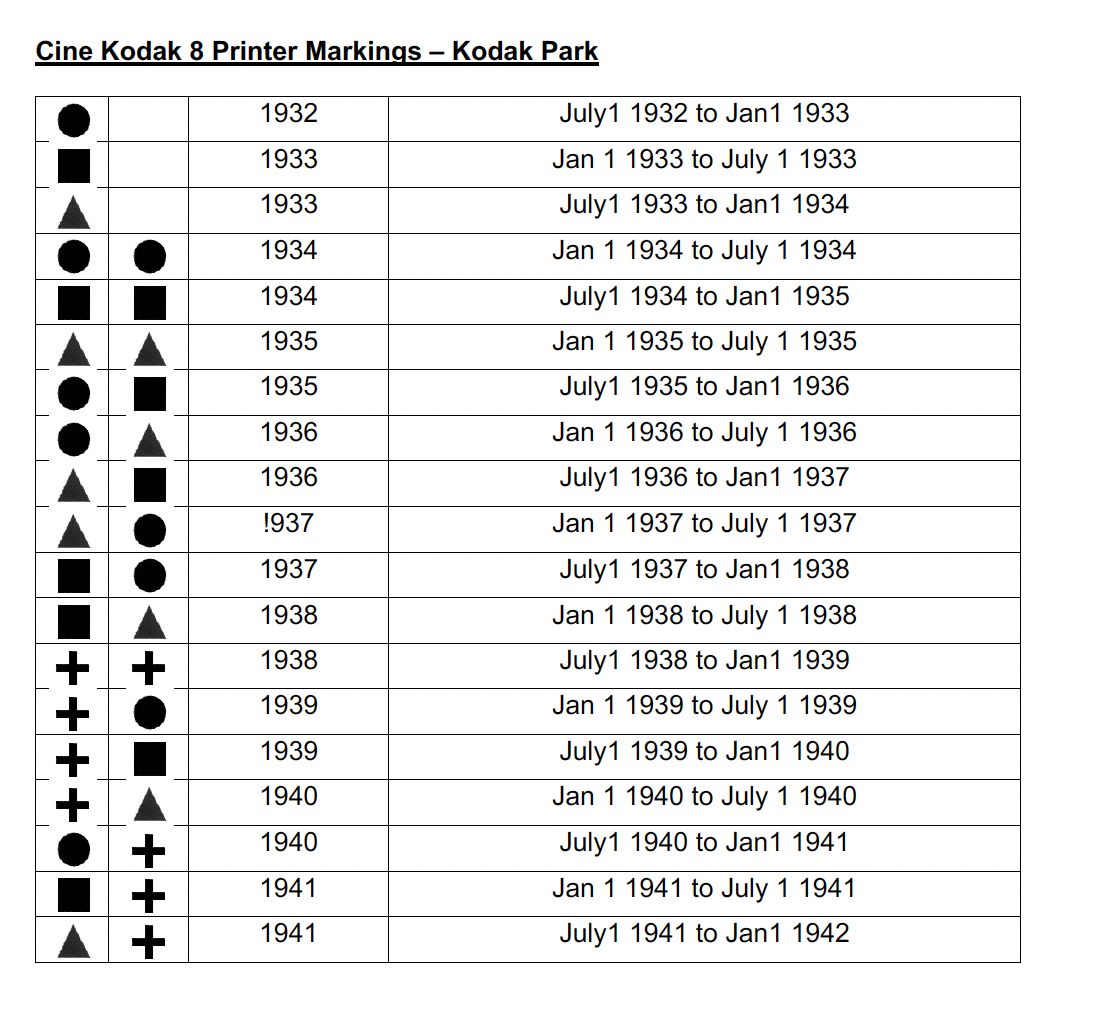 You will see from above that Kodak changes the edge marking when they have published a date range to a new date. Sound Negatives and colour print stocks no longer have edge printing because it would cause problems with digital sound tracks that are positioned on the outside of the perforations. need to take care when identifying film date codes. Also some of the early symbols vary and can be difficult to identify.