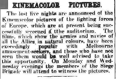 The programme included a film shot only four days earlier. This was a clear reference by Urban and Smith to the fact that Kinemacolor, recording on the film the colours of the scene in black and white tones, could be printed and reproduced like any ordinary monochrome film – quickly, instead of the laborious and time consuming business of hand colouring or stencil colouring that audiences were used to with coloured films.
