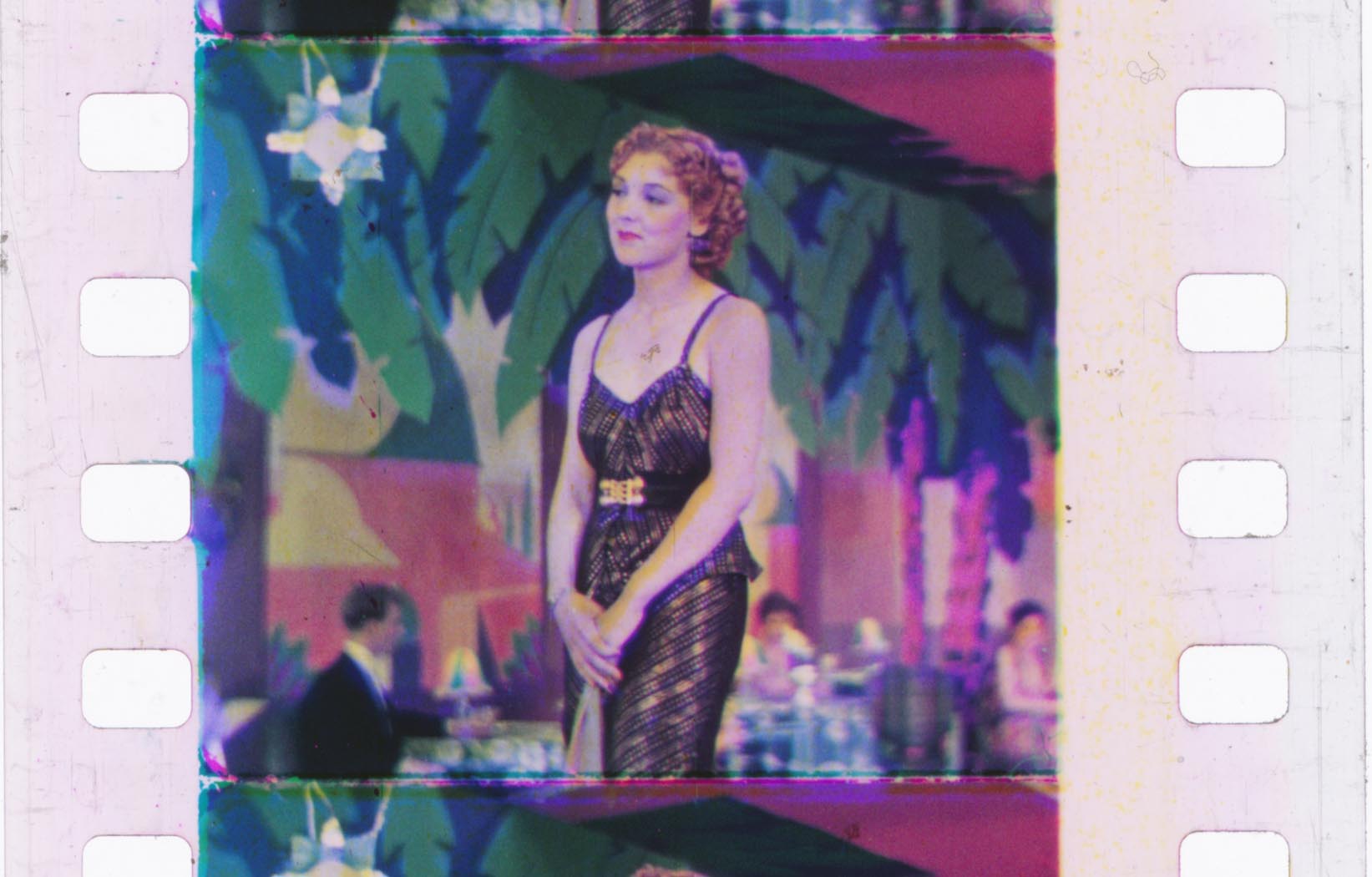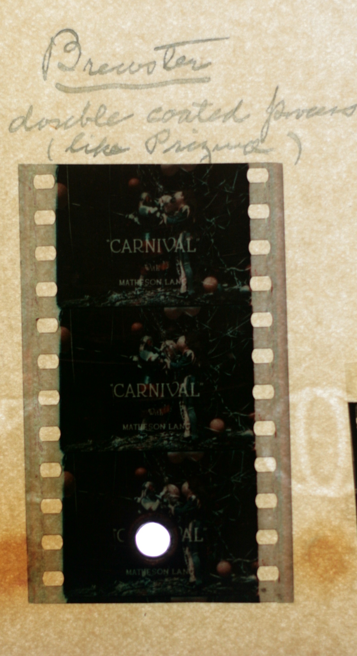 This image comes from the National Science and Media Museum, the Charles Urban Collection.  The film is stapled to a piece of paper carrying written information.  The sample could not be removed hence the poor quality.  The sample  is a title frame which says  'Carnival with Matheson Lang'