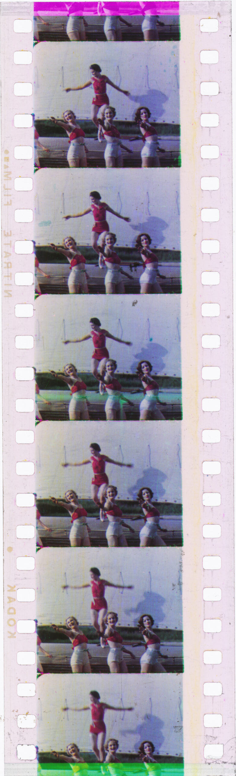 Note the magenta dye at the top of the image and the mixture of cyan and yellow dye at the bottom. In the image at the top of the page you can see that the yellow image that was printed by imbibition is slightly out of position