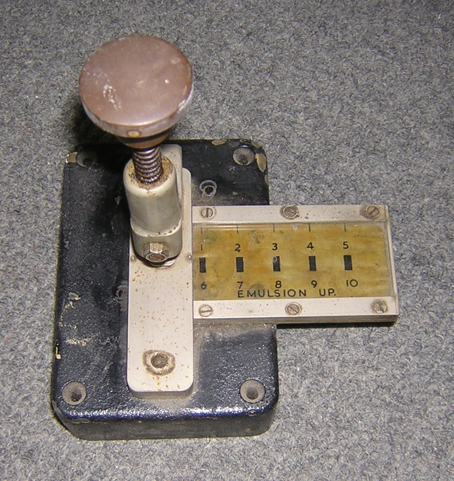 Note the black lines alongside the light value warning the printer operator that the light changes were quick. Debrie and other printing machine used the Debrie notch to move a chart. The Waterhouse chart had holes punched in a length of black film leader, the size of the hole gave the amount of exposure to the print film. For colour printing filters could be fixed over the holes. You can see a sample at the top of the page, click the image to see a larger image. Debrie also used a system of black film leader with rectangle holes that told the printing machine when a light change should take place. Again there is sample at te top of the page. It was called a long chart and the one with holes a short chart.
